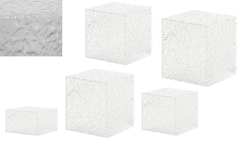Διαστάσεις: 27cm x 30cm ύψος, 25cm x 25cm ύψος, 23cm x 20cm ύψος, 21cm x 15cm ύψος, 19cm x 10cm ύψος. Εσωτερικά ανάγλυφο, εξωτερικά λείο.