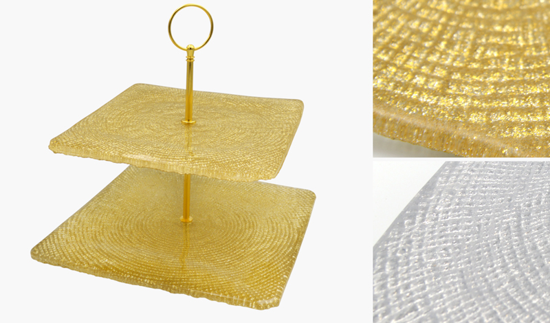 Διαστάσεις: πιάτα 24cm x 24cm, 20cm x 20cm. ύψος 28cm. Ασημί χερούλι/χρυσό χερούλι. Λεία επιφάνεια από τη πάνω μεριά και ανάγλυφο με γκλίτερ από τη κάτω μεριά.