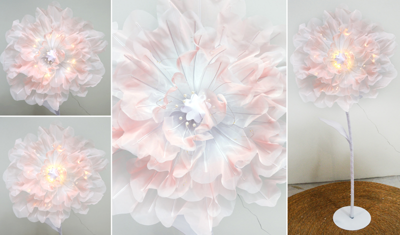 Διαστάσεις: 60cm περίπου ανοιχτό το λουλούδι. 160cm ύψος. Το led είναι "κινούμενα" στο λουλούδι. Περιέχει και καλώδιο για μπρίζα.